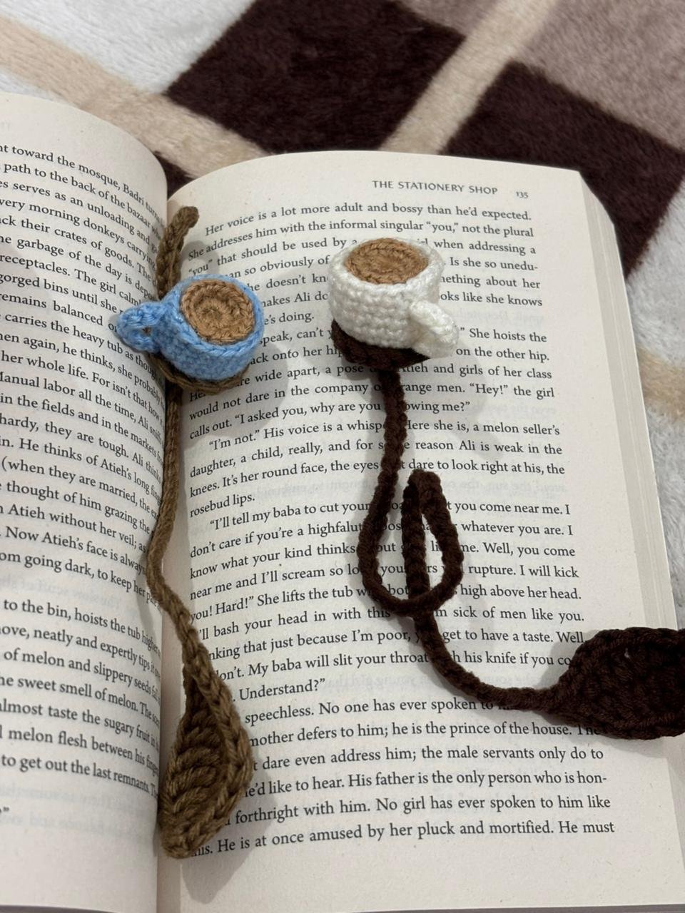 Add a cozy handmade touch to your reading time with this adorable crochet cup bookmark. Carefully handmade using soft yarn, this bookmark features a tiny coffee cup with a spoon and a long crocheted chain that fits perfectly between the pages of your book.