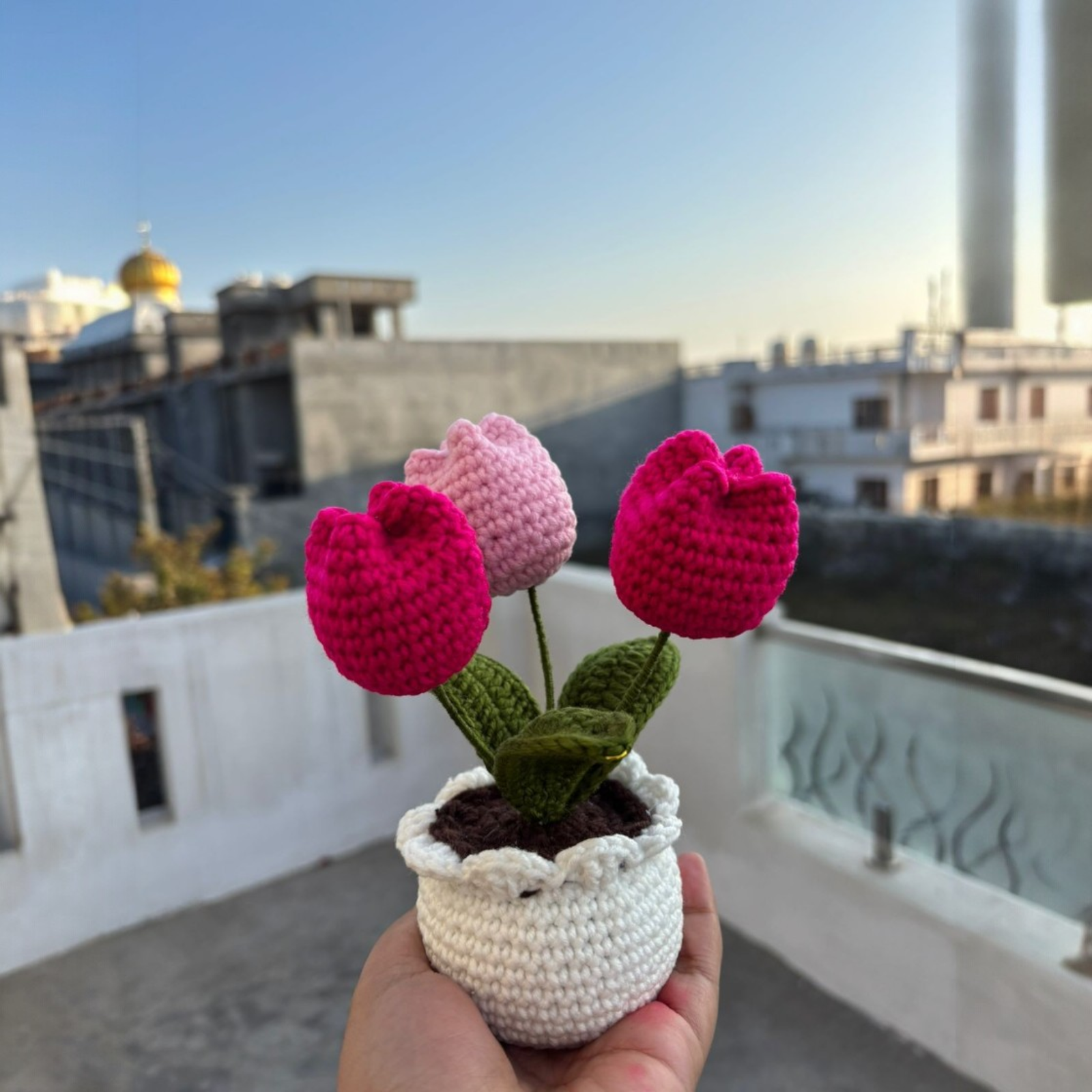 The soft tulip blooms paired with detailed green leaves and a cute crochet pot make it a timeless décor piece that never fades.